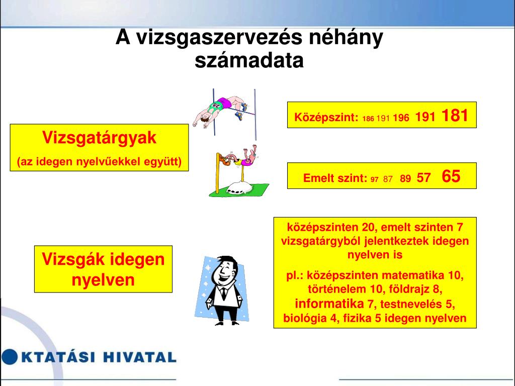 A vizsgaszervezés néhány számadata Középszint:186 191 196 191 181 Vizsgatárgyak (az idegen nyelvűekkel együtt) Emelt szint: 978789 57 65 középszinten 20, emelt szinten 7 vizsgatárgyból jelentkeztek idegen nyelven is pl.: középszinten matematika 10, történelem 10, földrajz 8, informatika 7, testnevelés 5, biológia 4, fizika 5 idegen nyelven Vizsgák idegen nyelven