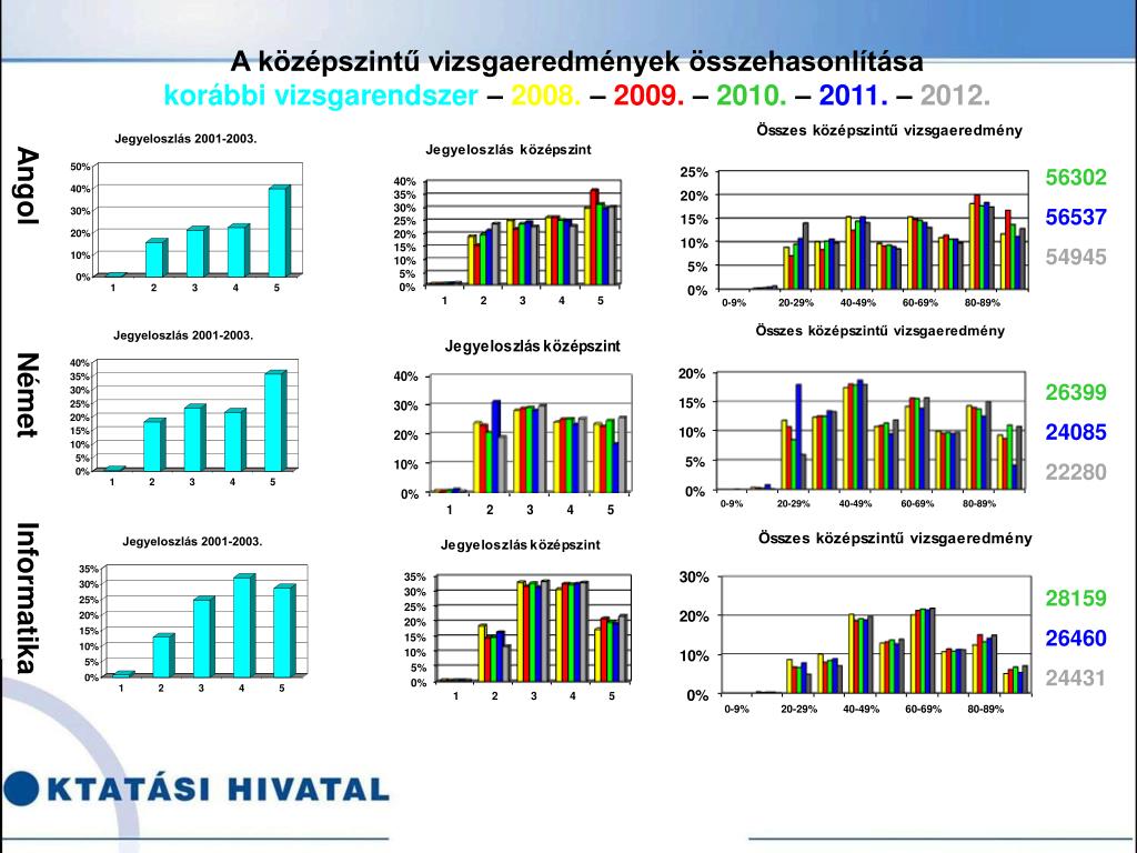 A középszintű vizsgaeredmények összehasonlítása korábbi vizsgarendszer – 2008.– 2009. – 2010. – 2011. – 2012. Angol 56302 56537 54945 Német 26399 24085 22280 Informatika 28159 26460 24431