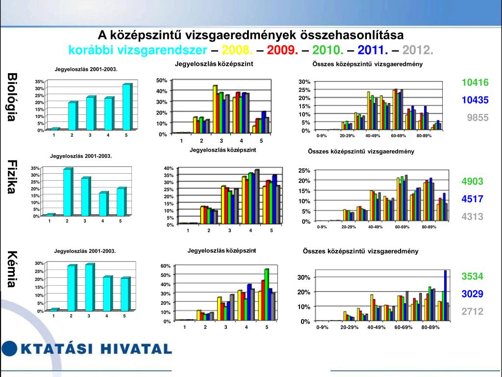 A középszintű vizsgaeredmények összehasonlítása korábbi vizsgarendszer – 2008.– 2009. – 2010. – 2011. – 2012. Biológia 10416 10435 9855 Fizika 4903 4517 4313 Kémia 3534 3029 2712