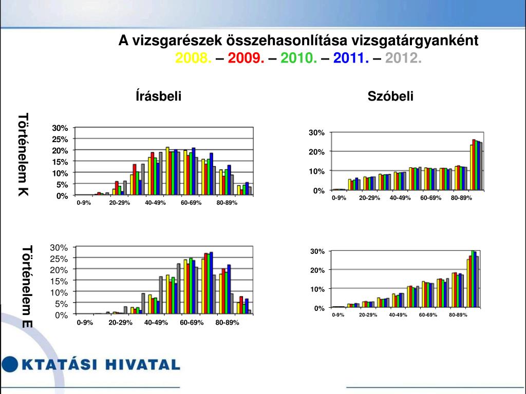 A vizsgarészek összehasonlítása vizsgatárgyanként 2008. – 2009. – 2010. – 2011. – 2012. Írásbeli Szóbeli Történelem K Történelem E
