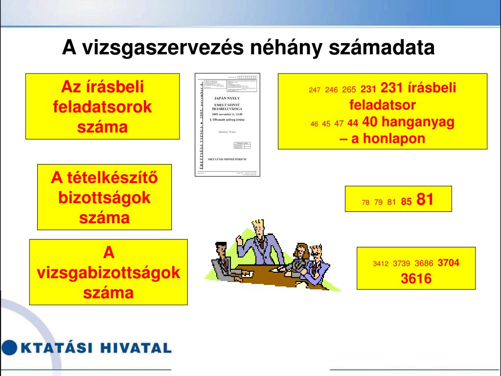 A vizsgaszervezés néhány számadata Az írásbeli feladatsorok száma 247246 265 231 231 írásbeli feladatsor 46454744 40 hanganyag – a honlapon A tételkészítő bizottságok száma 78798185 81 A vizsgabizottságok száma 34123739368637043616