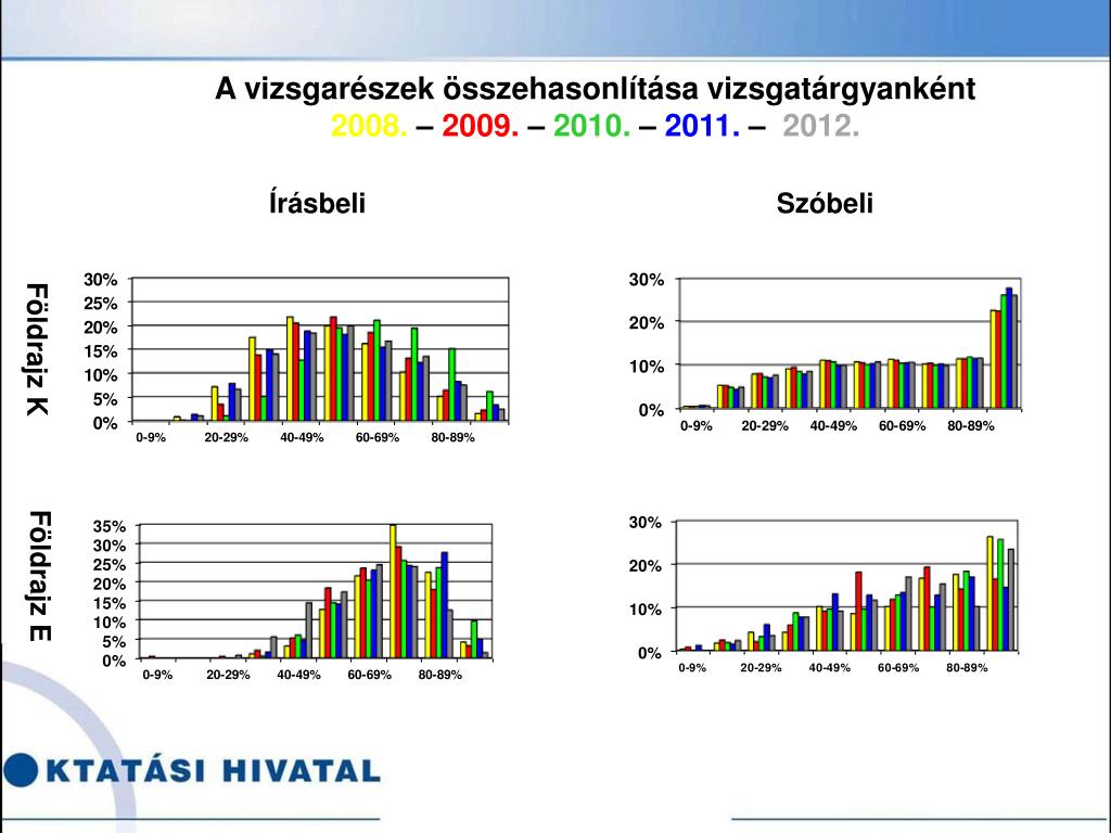 A vizsgarészek összehasonlítása vizsgatárgyanként 2008. – 2009. – 2010. – 2011. – 2012. Írásbeli Szóbeli Földrajz K Földrajz E