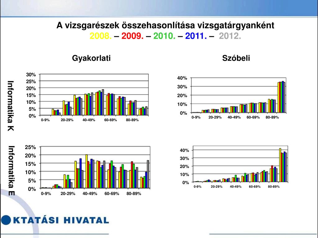 A vizsgarészek összehasonlítása vizsgatárgyanként 2008. – 2009. – 2010. – 2011. – 2012. Gyakorlati Szóbeli Informatika K Informatika E