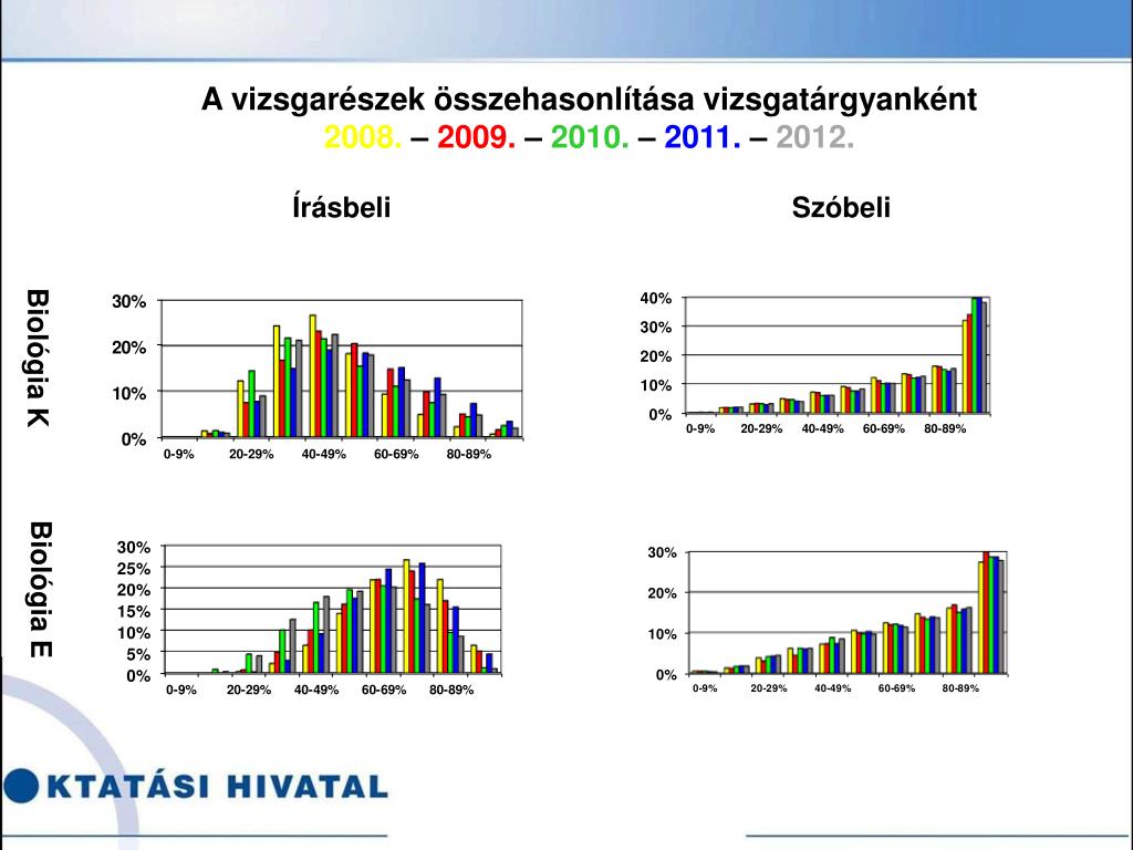 A vizsgarészek összehasonlítása vizsgatárgyanként 2008. – 2009. – 2010. – 2011. – 2012. Írásbeli Szóbeli Biológia K Biológia E