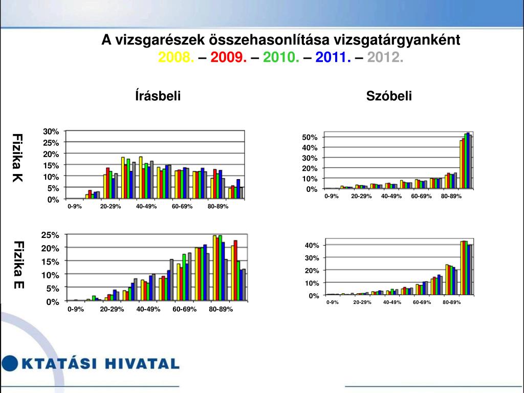 A vizsgarészek összehasonlítása vizsgatárgyanként 2008. – 2009. – 2010. – 2011. – 2012. Írásbeli Szóbeli Fizika K Fizika E