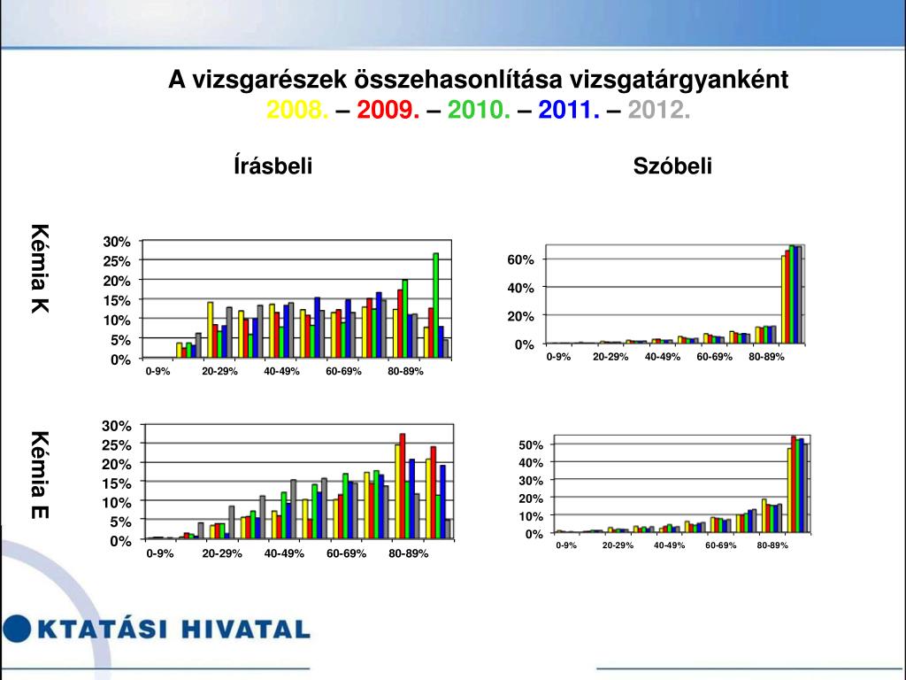 A vizsgarészek összehasonlítása vizsgatárgyanként 2008. – 2009. – 2010. – 2011. – 2012. Írásbeli Szóbeli Kémia K Kémia E