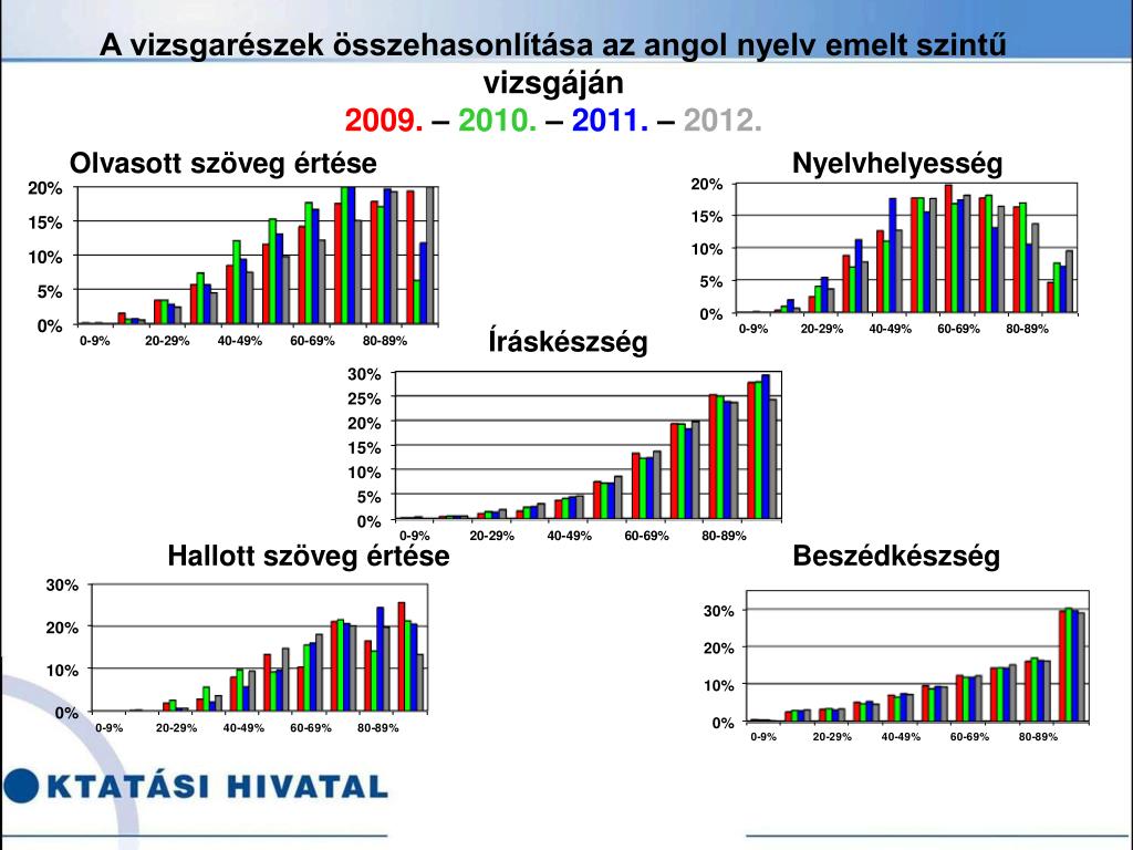 A vizsgarészek összehasonlítása az angol nyelv emelt szintű vizsgáján 2009.– 2010. – 2011. – 2012. Olvasott szöveg értése Nyelvhelyesség Íráskészség Hallott szöveg értése Beszédkészség