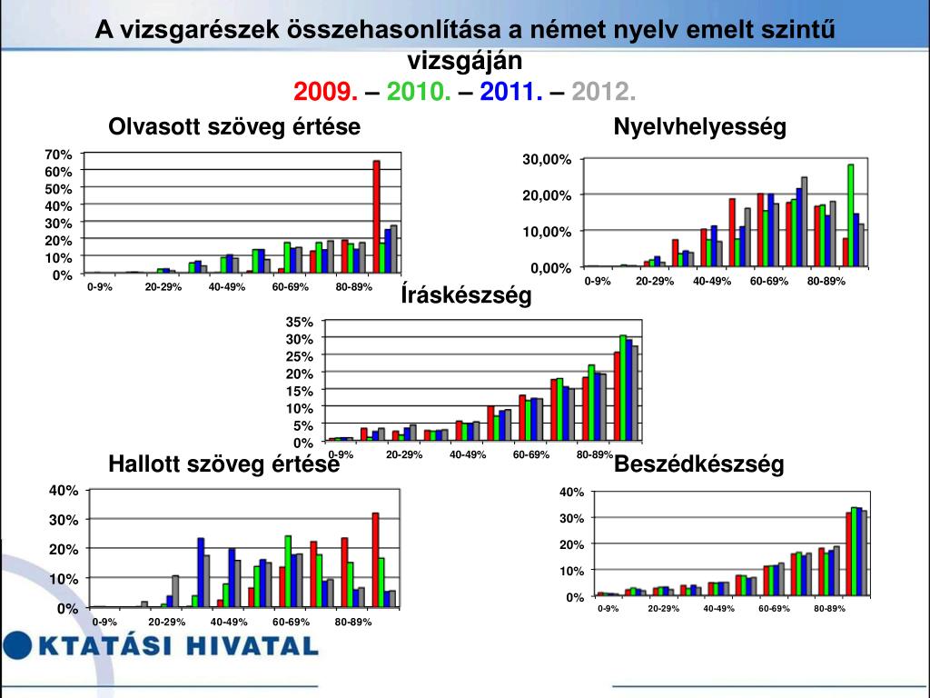 A vizsgarészek összehasonlítása a német nyelv emelt szintű vizsgáján 2009.– 2010. – 2011. – 2012. Olvasott szöveg értése Nyelvhelyesség Íráskészség Hallott szöveg értése Beszédkészség
