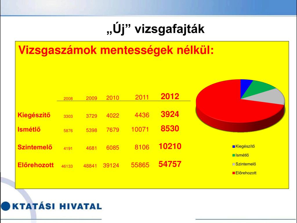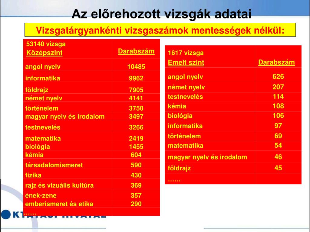 Az előrehozott vizsgák adatai Vizsgatárgyankénti vizsgaszámok mentességek nélkül: