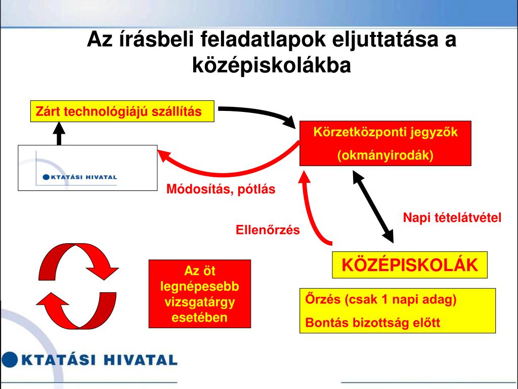 Az írásbeli feladatlapok eljuttatása a középiskolákba Zárt technológiájú szállítás Körzetközponti jegyzők (okmányirodák) Módosítás, pótlás Napi tételátvétel Ellenőrzés KÖZÉPISKOLÁK Az öt legnépesebb vizsgatárgy esetében Őrzés (csak 1 napi adag) Bontás bizottság előtt