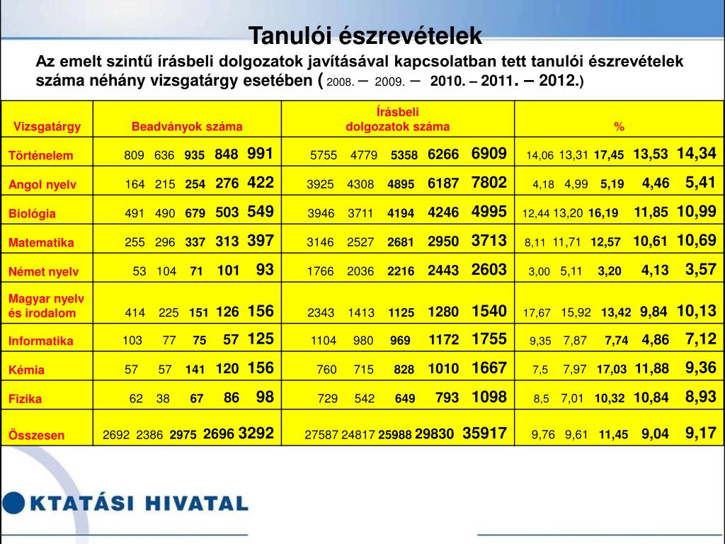 Tanulói észrevételek Az emelt szintű írásbeli dolgozatok javításával kapcsolatban tett tanulói észrevételek száma néhány vizsgatárgy esetében ( 2008.– 2009. – 2010. – 2011. – 2012.)