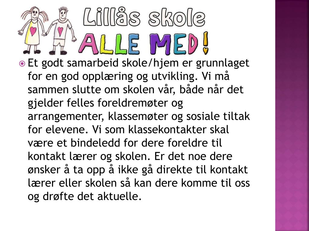 Et godt samarbeid skole/hjem er grunnlaget for en god opplæring og utvikling. Vi må sammen slutte om skolen vår, både når det gjelder felles foreldremøter og arrangementer, klassemøter og sosiale tiltak for elevene. Vi som klassekontakter skal være et bindeledd for dere foreldre til kontakt lærer og skolen. Er det noe dere ønsker å ta opp å ikke gå direkte til kontakt lærer eller skolen så kan dere komme til oss og drøfte det aktuelle.