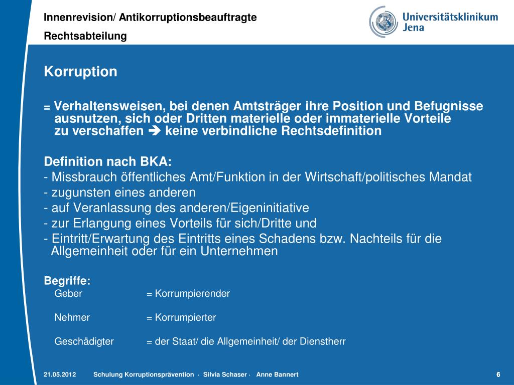 Bestellung eines Antikorruptionsbeauftragten Methoden der Prävention: Risikoanalyse Feststellung korruptionsgefährdeter Arbeitsgebiete Korruptionsindikatoren überprüfen Belehrungen (Gelöbnis) und Information Sensibilisierung Vorbildwirkung Am UKJ: Richtlinie zur Vermeidung der Korruption vom 09.03.2005 auf der Seite der Antikorruptionsbeauftragten (AKB) im Intranet http://www.innenrevision.ukj.de/Antikorruptionsstelle.html AKB wird vom Dienststellenleiter bestellt – Aufgaben: Verhüten und Aufdecken von Korruption, entsprechende Beratung AKB ist Ansprechpartner für jeden Mitarbeiter Schulung Korruptionsprävention · Silvia Schaser· Anne Bannert 5 5