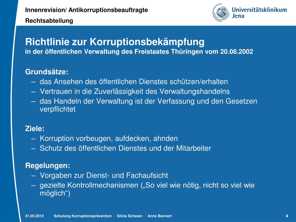 Bundeslagebild Korruption 2010 im Vergleich 2008 Schwerpunkte der Korruption allg. öffentlicher Dienst 35 % / 49 % Wirtschaftssektor 64 % / 37 % Zugehörigkeit der „Nehmer“ Gesundheitswesen 0,8 % / 6,0 % Universität/Bildung 1,9 % / 7,0 % Bauwesen 0,6 % / 13,0 % 10 % der Nehmer waren Amtsträger Jüngste Beispiele: „In Gelsenkirchen wurden Fördergelder veruntreut“ „Transplantationsarzt Broelsch ist jetzt im Gefängnis“ „Chefarzt der Eisenberger Orthopädie zu Geldstrafe verurteilt“ 21.05.2012 Schulung Korruptionsprävention · Silvia Schaser· Anne Bannert