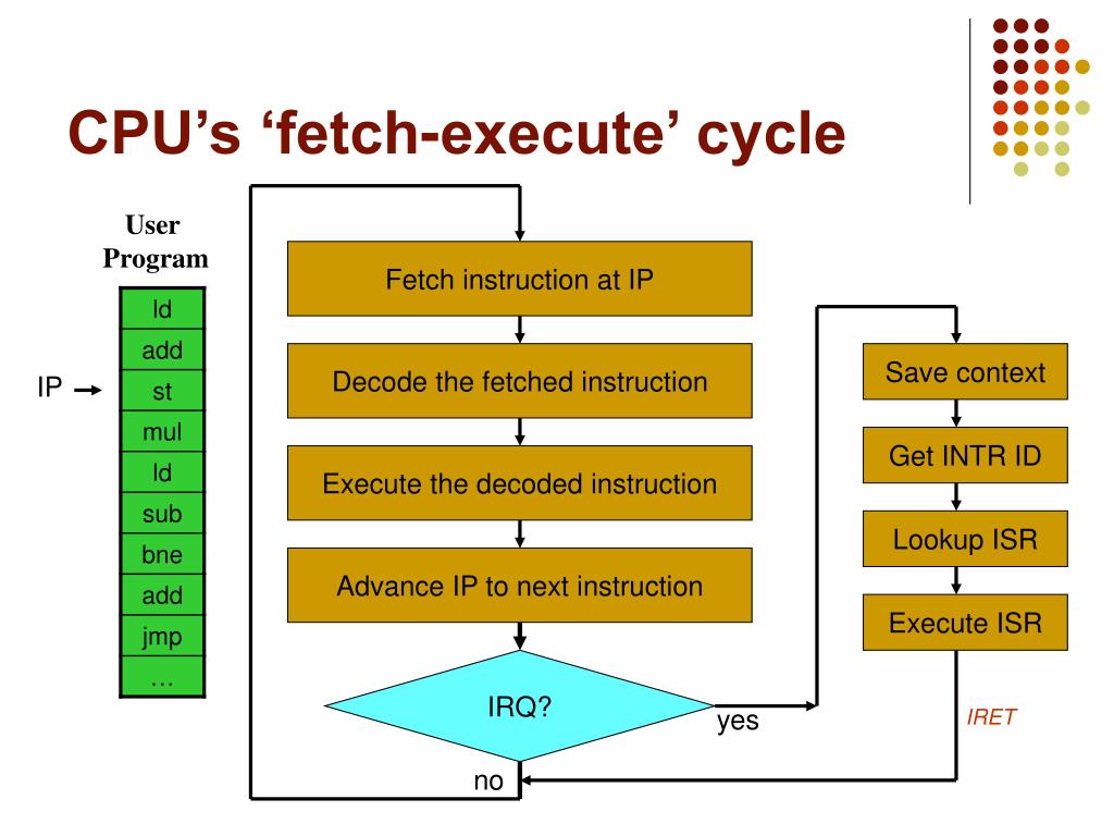 CPU’s ‘fetch-execute’ cycle User Program Fetch instruction at IP Decode the fetched instruction Save context IP Get INTR ID Execute the decoded instruction Lookup ISR Advance IP to next instruction Execute ISR IRQ? yes IRET no