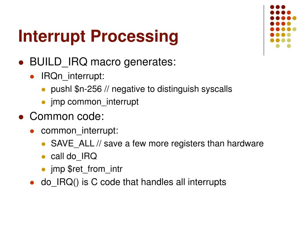 Interrupt Processing • BUILD_IRQ macro generates: • IRQn_interrupt: • pushl $n-256 // negative to distinguish syscalls • jmp common_interrupt • Common code: • common_interrupt: • SAVE_ALL // save a few more registers than hardware • call do_IRQ • jmp $ret_from_intr • do_IRQ() is C code that handles all interrupts