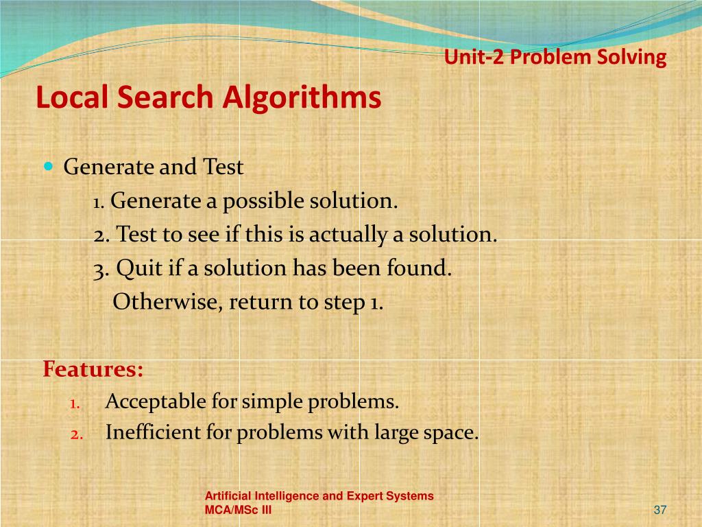 Unit-2 Problem Solving Local Search Algorithms • Generate and Test 1. Generate a possible solution. 2. Test to see if this is actually a solution. 3. Quit if a solution has been found. Otherwise, return to step 1. Features: • Acceptable for simple problems. • Inefficient for problems with large space. Artificial Intelligence and Expert Systems MCA/MSc III