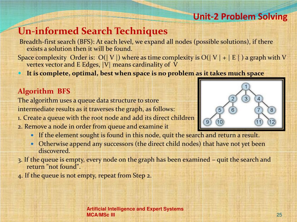 Unit-2 Problem Solving Un-informed Search Techniques Breadth-first search (BFS): At each level, we expand all nodes (possible solutions), if there exists a solution then it will be found. Space complexity Order is: O(| V |) where as time complexity is O(| V | + | E | ) a graph with V vertex vector and E Edges, |V| means cardinality of V • It is complete, optimal, best when space is no problem as it takes much space Algorithm BFS The algorithm uses a queue data structure to store intermediate results as it traverses the graph, as follows: 1. Create a queue with the root node and add its direct children 2. Remove a node in order from queue and examine it • If the element sought is found in this node, quit the search and return a result. • Otherwise append any successors (the direct child nodes) that have not yet been discovered. 3. If the queue is empty, every node on the graph has been examined – quit the search and return "not found". 4. If the queue is not empty, repeat from Step 2. Artificial Intelligence and Expert Systems MCA/MSc III