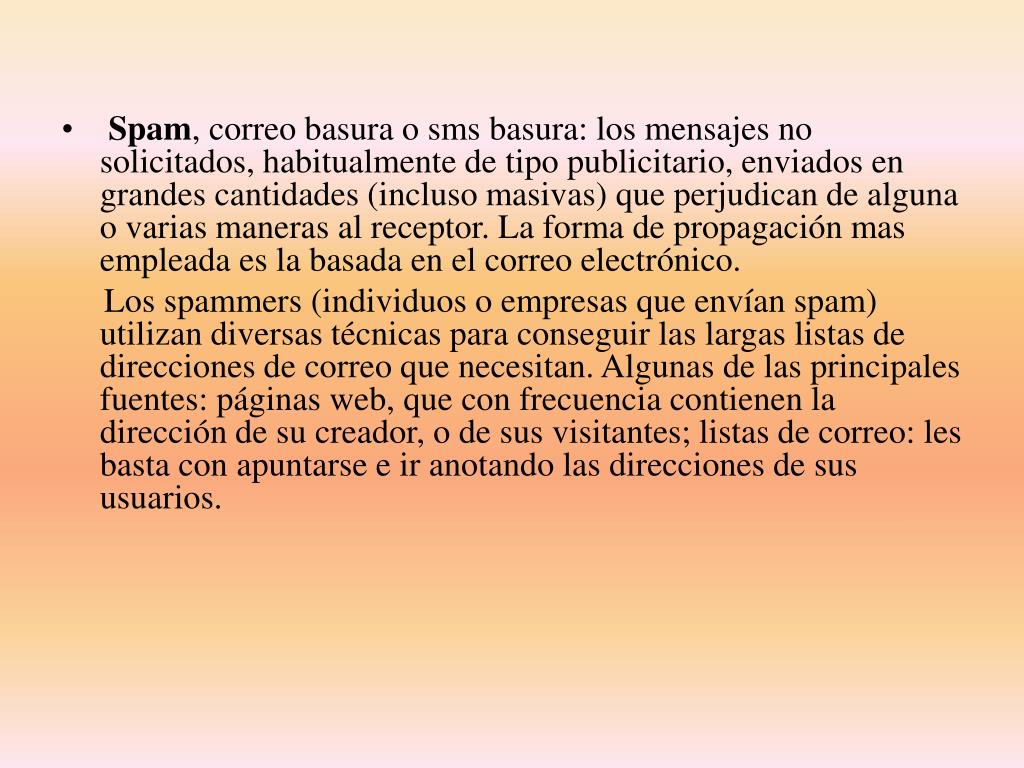 Spam, correo basura o sms basura: los mensajes no solicitados, habitualmente de tipo publicitario, enviados en grandes cantidades (incluso masivas) que perjudican de alguna o varias maneras al receptor. La forma de propagación mas empleada es la basada en el correo electrónico. Los spammers (individuos o empresas que envían spam) utilizan diversas técnicas para conseguir las largas listas de direcciones de correo que necesitan. Algunas de las principales fuentes: páginas web, que con frecuencia contienen la dirección de su creador, o de sus visitantes; listas de correo: les basta con apuntarse e ir anotando las direcciones de sus usuarios.