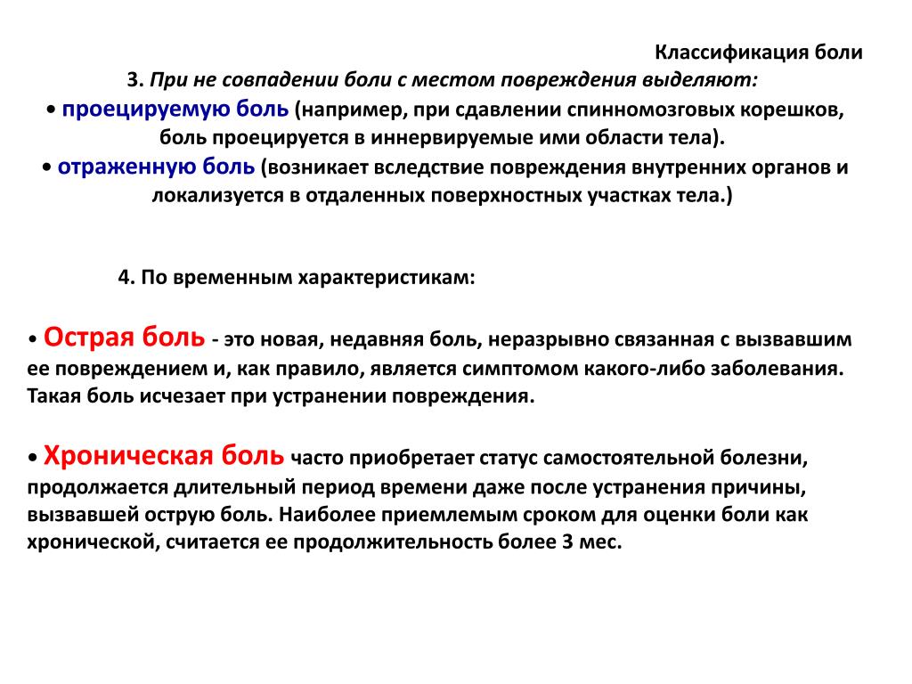 Классификация боли 3. При не совпадении боли с местом повреждения выделяют:• проецируемую боль (например, при сдавлении спинномозговых корешков, боль проецируется в иннервируемые ими области тела). • отраженную боль (возникает вследствие повреждения внутренних органов и локализуется в отдаленных поверхностных участках тела.) 4. По временным характеристикам: • Острая боль - это новая, недавняя боль, неразрывно связанная с вызвавшим ее повреждением и, как правило, является симптомом какого-либо заболевания. Такая боль исчезает при устранении повреждения. • Хроническая боль часто приобретает статус самостоятельной болезни, продолжается длительный период времени даже после устранения причины, вызвавшей острую боль. Наиболее приемлемым сроком для оценки боли как хронической, считается ее продолжительность более 3 мес.