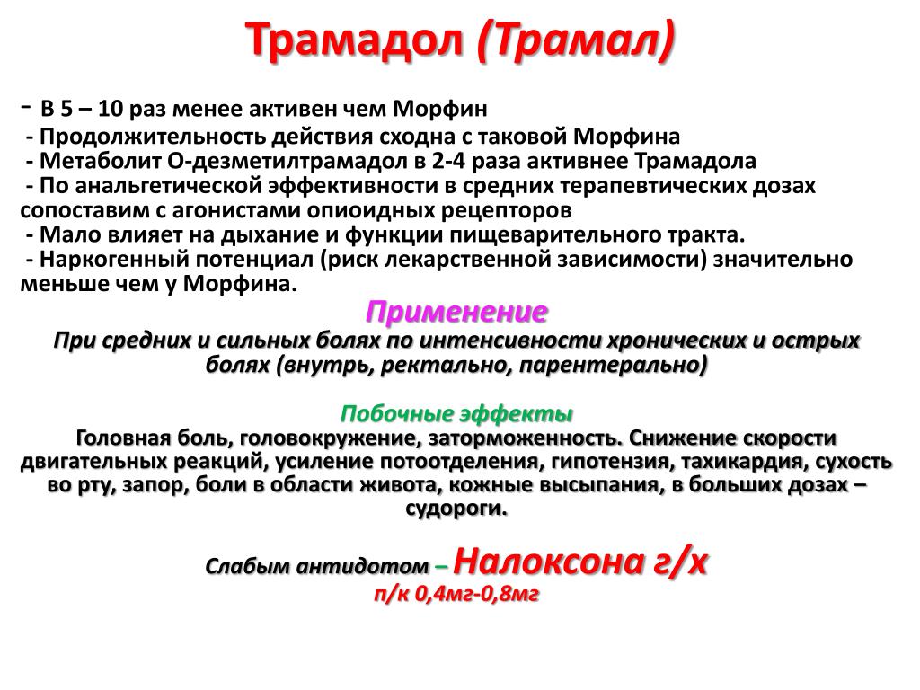 Трамадол(Трамал) - В 5 – 10 раз менее активен чем Морфин - Продолжительность действия сходна с таковой Морфина - Метаболит О-дезметилтрамадол в 2-4 раза активнее Трамадола - По анальгетической эффективности в средних терапевтических дозах сопоставим с агонистами опиоидных рецепторов - Мало влияет на дыхание и функции пищеварительного тракта. - Наркогенный потенциал (риск лекарственной зависимости) значительно меньше чем у Морфина. Применение При средних и сильных болях по интенсивности хронических и острых болях (внутрь, ректально, парентерально) Побочные эффекты Головная боль, головокружение, заторможенность. Снижение скорости двигательных реакций, усиление потоотделения, гипотензия, тахикардия, сухость во рту, запор, боли в области живота, кожные высыпания, в больших дозах – судороги. Слабым антидотом – Налоксона г/х п/к 0,4мг-0,8мг
