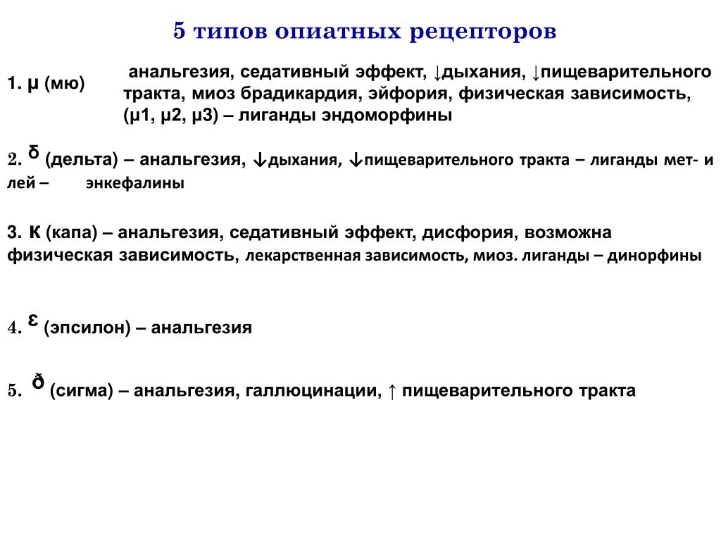 5 типовопиатныхрецепторов анальгезия, седативный эффект, ↓дыхания, ↓пищеварительноготракта,миозбрадикардия, эйфория, физическая зависимость, (μ1, μ2, μ3) – лигандыэндоморфины 1. μ (мю) 2. ᵟ (дельта) – анальгезия, ↓дыхания, ↓пищеварительноготракта– лиганды мет- и лей – энкефалины 3.к (капа) –анальгезия, седативныйэффект, дисфория, возможна физическая зависимость, лекарственнаязависимость, миоз. лиганды – динорфины 4. ᵋ (эпсилон) – анальгезия 5.ᶞ (сигма) – анальгезия, галлюцинации, ↑ пищеварительноготракта