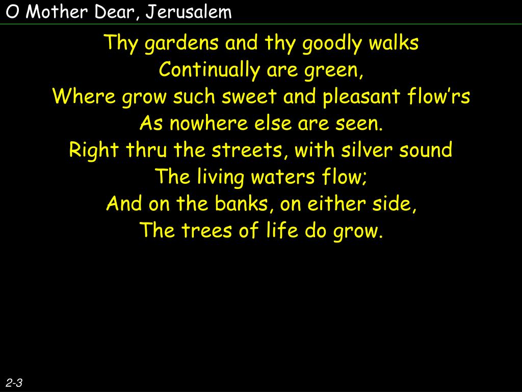O Mother Dear, Jerusalem Thy gardens and thy goodly walks Continually are green, Where grow such sweet and pleasant flow’rs As nowhere else are seen. Right thru the streets, with silver sound The living waters flow; And on the banks, on either side, The trees of life do grow. 2-3