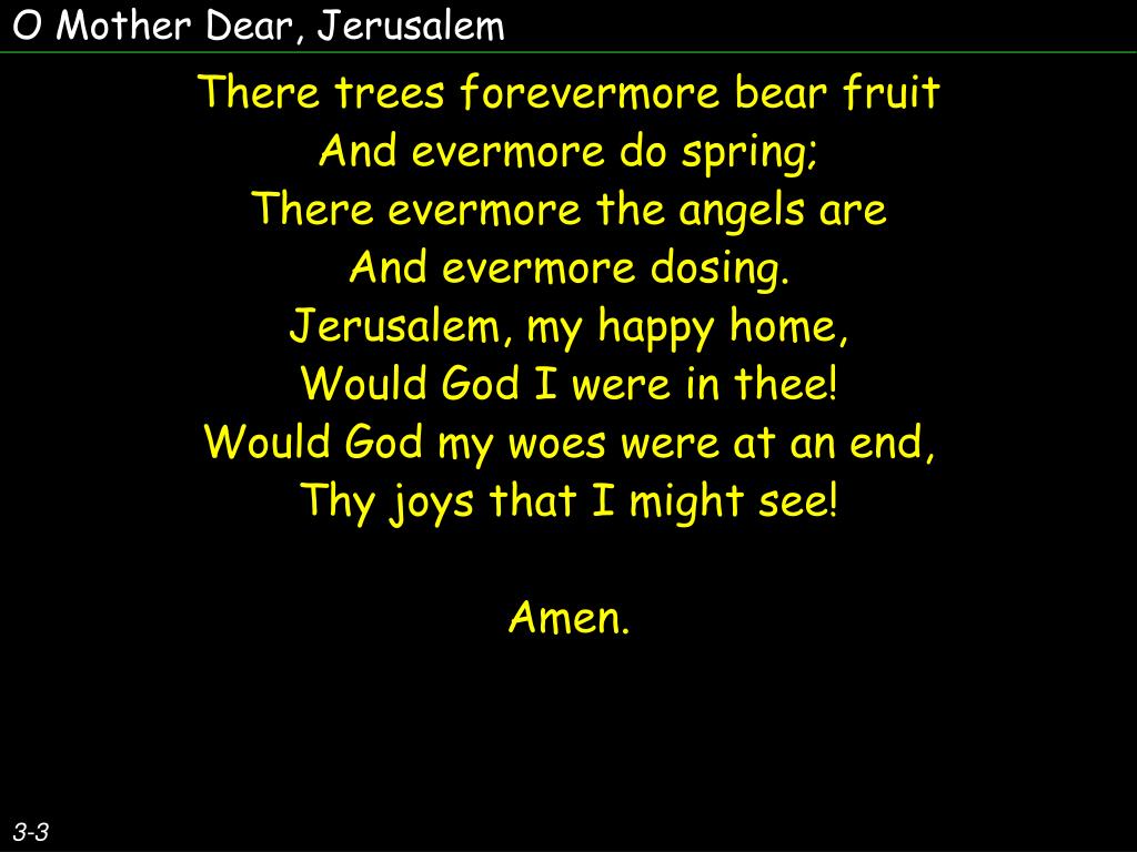 O Mother Dear, Jerusalem There trees forevermore bear fruit And evermore do spring; There evermore the angels are And evermore dosing. Jerusalem, my happy home, Would God I were in thee! Would God my woes were at an end, Thy joys that I might see! Amen. 3-3
