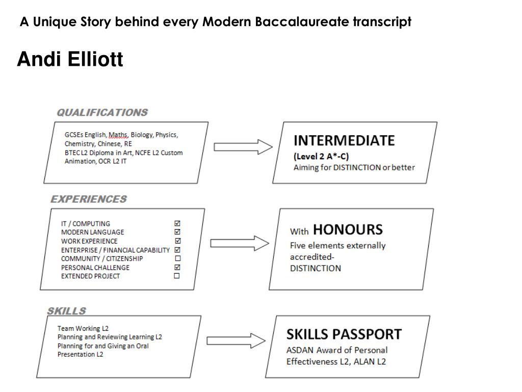 A Unique Story behind every Modern Baccalaureate transcript An extremely able student, possibly in the top 4% in the country- secured very high grades in nearly every GCSE …however, only a PASS for Honours programme (Language GCSE qualification perhaps, but little else externally accredited). No community work? Why has such an able student got so little to show in terms of employability skills?