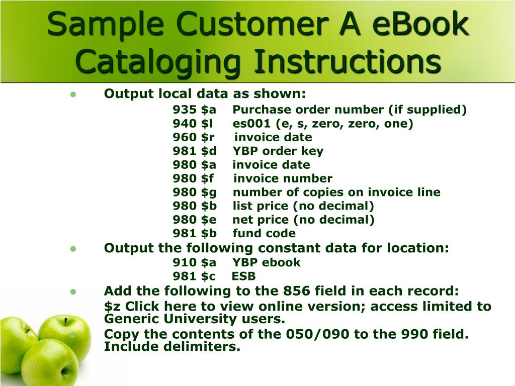 Sample Customer A eBook Cataloging Instructions • Output local data as shown: 935 $a Purchase order number (if supplied) 940 $l es001 (e, s, zero, zero, one) 960 $r invoice date 981 $d YBP order key 980 $a invoice date 980 $f invoice number 980 $g number of copies on invoice line 980 $b list price (no decimal) 980 $e net price (no decimal) 981 $b fund code • Output the following constant data for location: 910 $a YBP ebook 981 $c ESB • Add the following to the 856 field in each record: $z Click here to view online version; access limited to Generic University users. • Copy the contents of the 050/090 to the 990 field. Include delimiters.