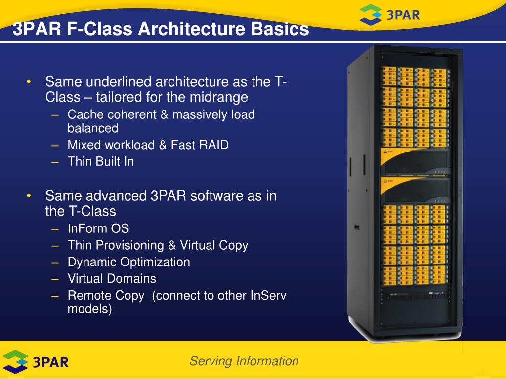 3PAR F-Class Architecture Basics • Same underlined architecture as the T-Class – tailored for the midrange • Cache coherent & massively load balanced • Mixed workload & Fast RAID • Thin Built In • Same advanced 3PAR software as in the T-Class • InForm OS • Thin Provisioning & Virtual Copy • Dynamic Optimization • Virtual Domains • Remote Copy (connect to other InServ models)