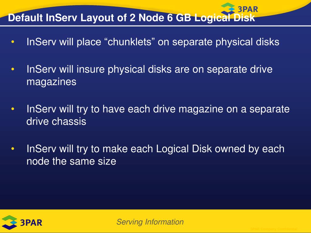 Default InServ Layout of 2 Node 6 GB Logical Disk • InServ will place “chunklets” on separate physical disks • InServ will insure physical disks are on separate drive magazines • InServ will try to have each drive magazine on a separate drive chassis • InServ will try to make each Logical Disk owned by each node the same size 3PAR Company Confidential