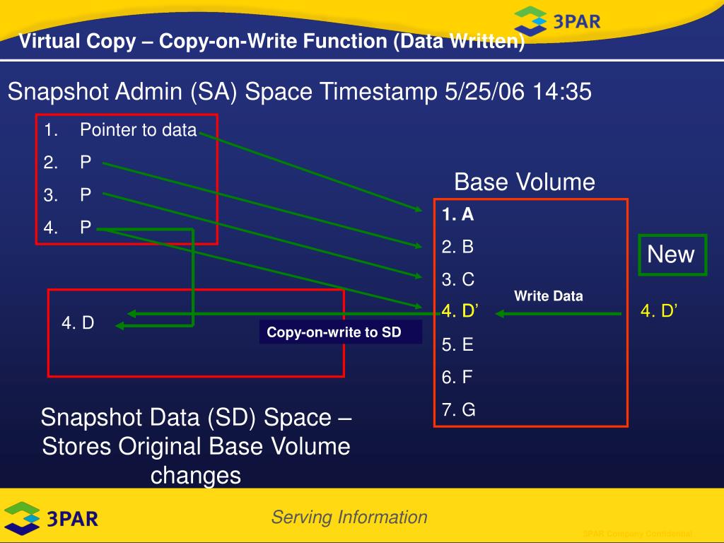 Virtual Copy – Copy-on-Write Function (Data Written) Snapshot Admin (SA) Space Timestamp 5/25/06 14:35 • Pointer to data • P • P • P Base Volume 1. A 2. B 3. C 5. E 6. F 7. G New Write Data 4. D 4. D’ 4. D’ 4. D Copy-on-write to SD Snapshot Data (SD) Space – Stores Original Base Volume changes 3PAR Company Confidential