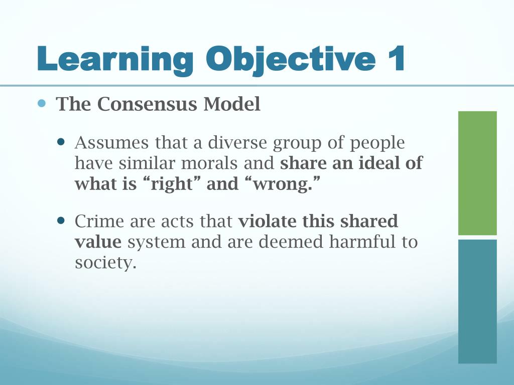 Learning Objective 1 • The Consensus Model • Assumes that a diverse group of people have similar morals and share an ideal of what is “right” and “wrong.” • Crime are acts that violate this shared value system and are deemed harmful to society.
