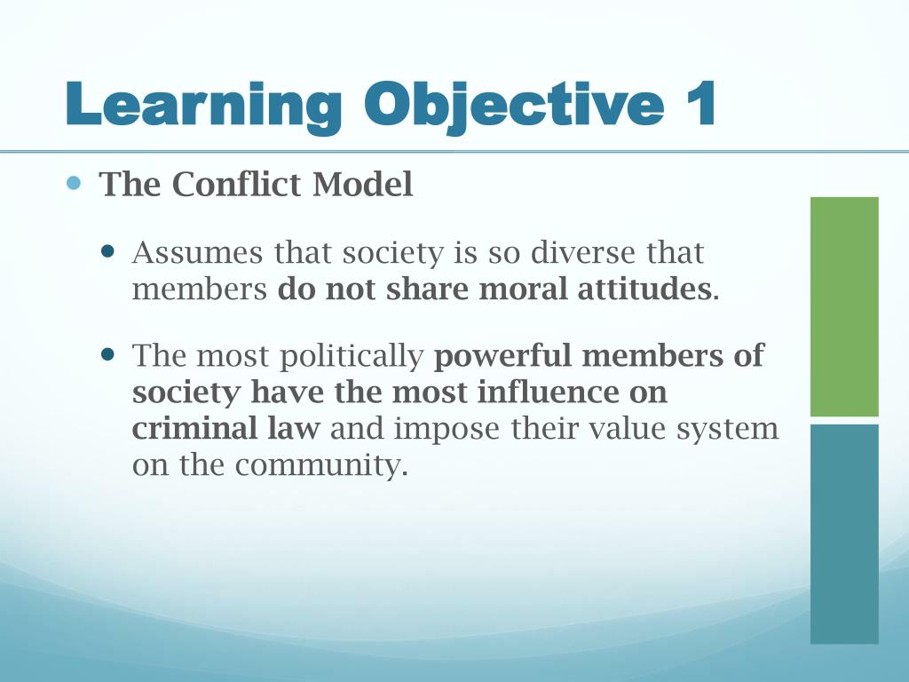 Learning Objective 1 • The Conflict Model • Assumes that society is so diverse that members do not share moral attitudes. • The most politically powerful members of society have the most influence on criminal law and impose their value system on the community.