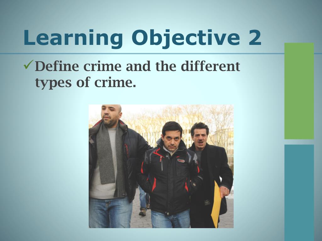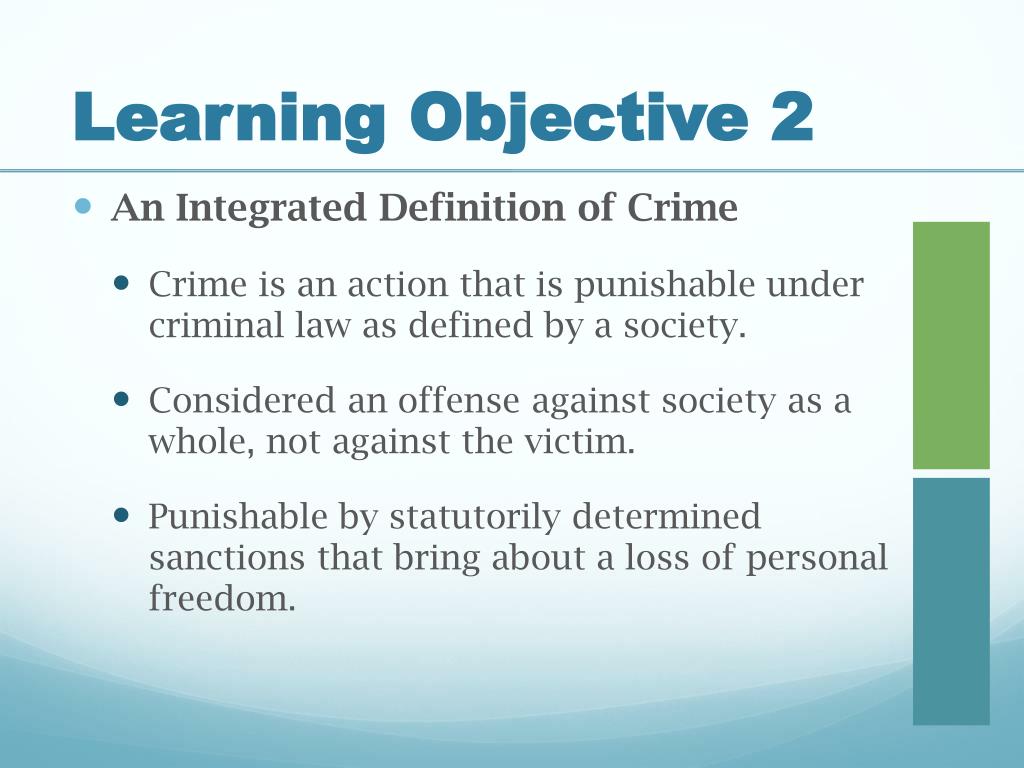 Learning Objective 2 • An Integrated Definition of Crime • Crime is an action that is punishable under criminal law as defined by a society. • Considered an offense against society as a whole, not against the victim. • Punishable by statutorily determined sanctions that bring about a loss of personal freedom.