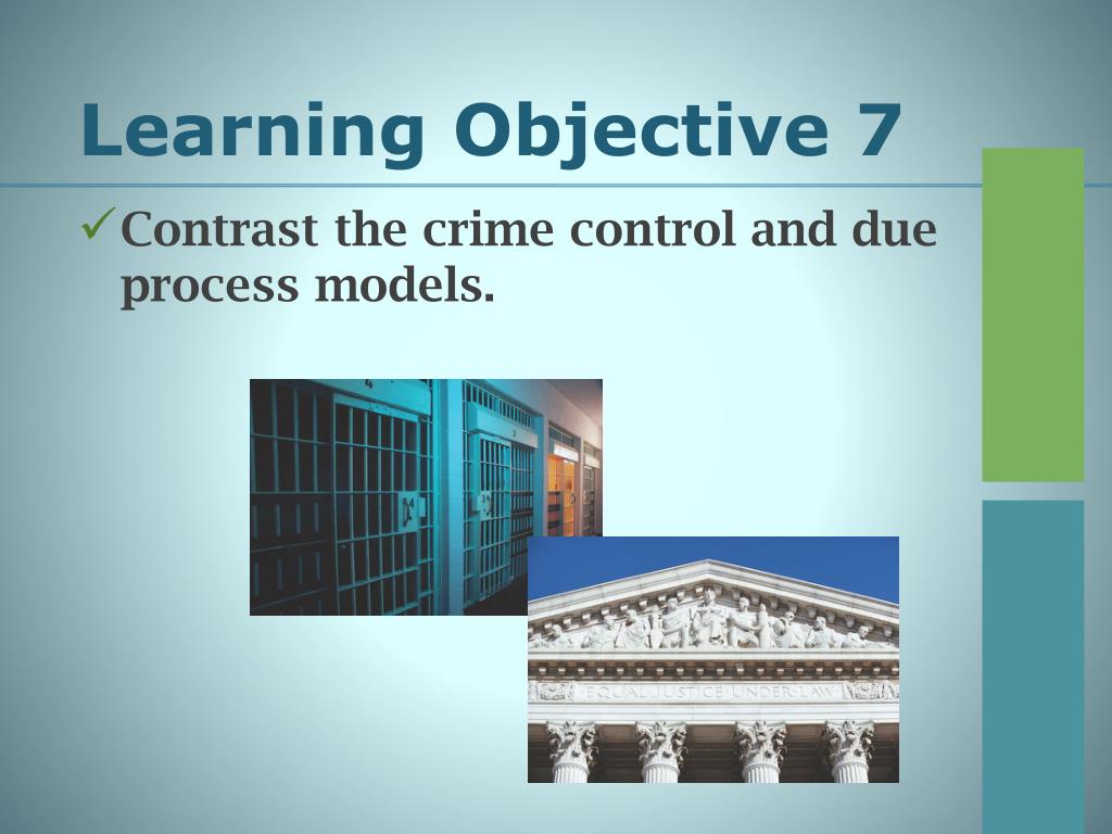 Learning Objective 7 • The crime control model • Primary emphasis on the right of society to be protected from crime. • The due process model • Primary emphasis on the right of the individual to be protected from the power of government.
