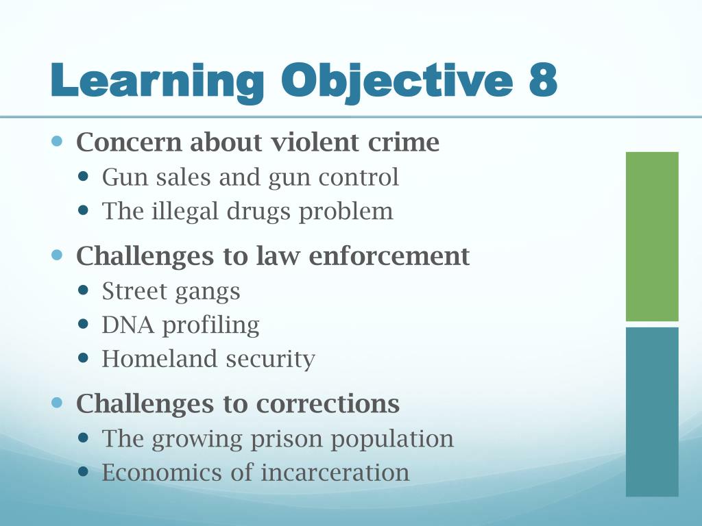 Learning Objective 8 • Concern about violent crime • Gun sales and gun control • The illegal drugs problem • Challenges to law enforcement • Street gangs • DNA profiling • Homeland security • Challenges to corrections • The growing prison population • Economics of incarceration