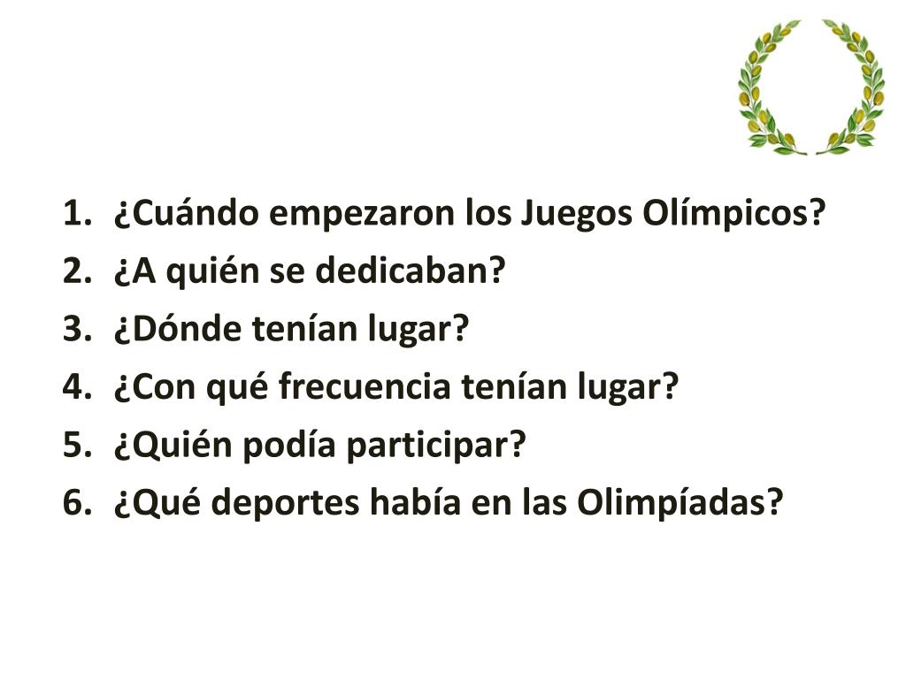 ¿Cuándoempezaron los JuegosOlímpicos? • ¿A quién se dedicaban? • ¿Dóndeteníanlugar? • ¿Con quéfrecuenciateníanlugar? • ¿Quiénpodíaparticipar? • ¿Quédeporteshabía en lasOlimpíadas?