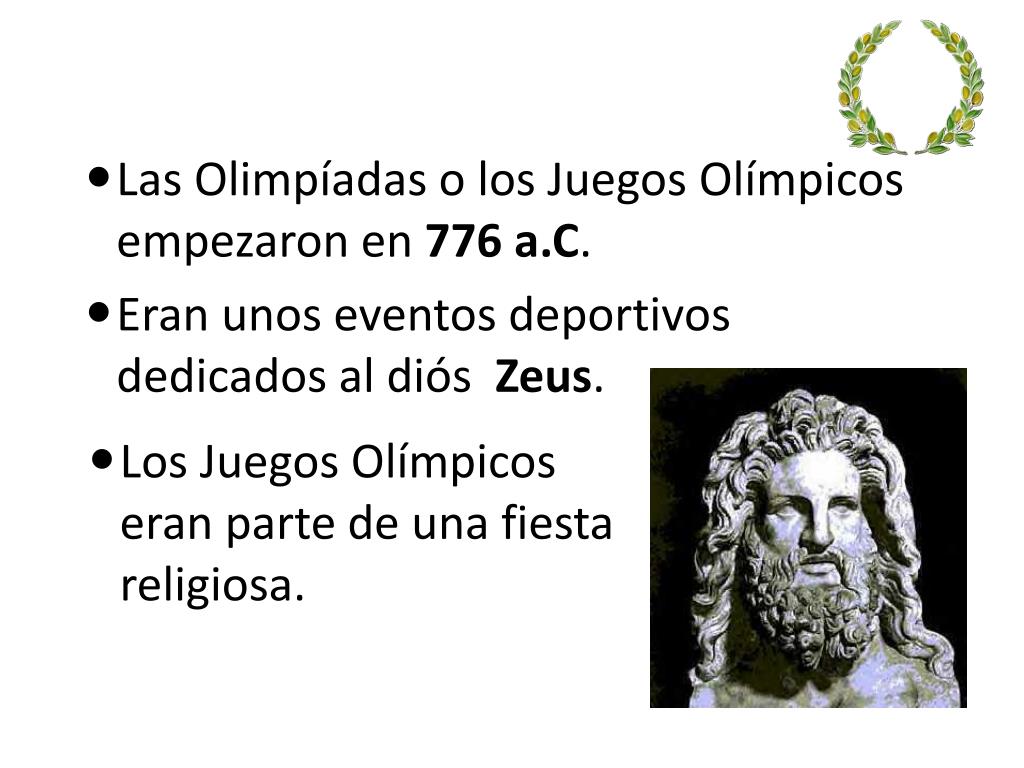 Las Olimpíadas o los JuegosOlímpicosempezaron en 776 a.C. • Eranunoseventosdeportivosdedicados al diósZeus. • Los JuegosOlímpicoseran parte de una fiesta religiosa.