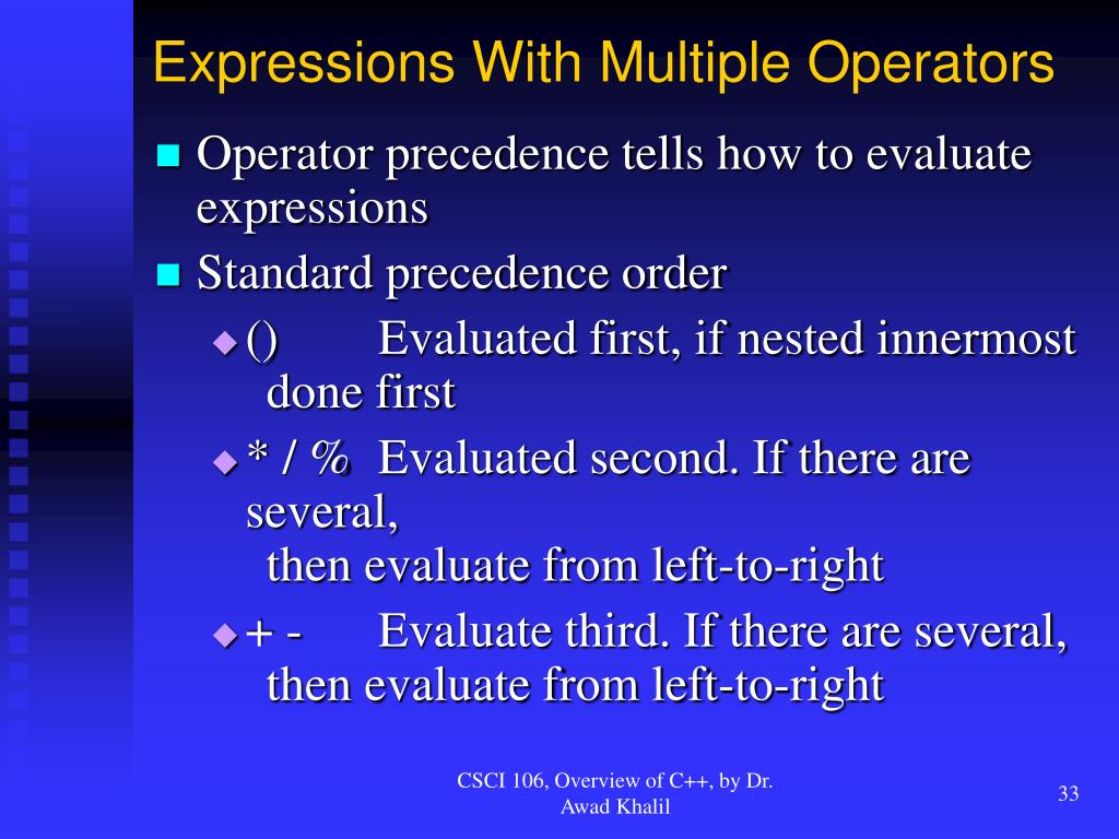 Expressions With Multiple Operators • Operator precedence tells how to evaluate expressions • Standard precedence order • () Evaluated first, if nested innermost done first • * / % Evaluated second. If there are several, then evaluate from left-to-right • + - Evaluate third. If there are several, then evaluate from left-to-right CSCI 106, Overview of C++, by Dr. Awad Khalil