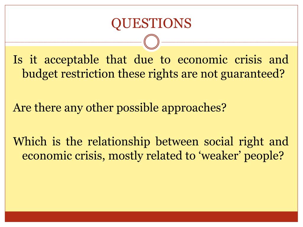 QUESTIONS Is it acceptable that due to economic crisis and budget restriction these rights are not guaranteed? Are there any other possible approaches? Which is the relationship between social right and economic crisis, mostly related to ‘weaker’ people?