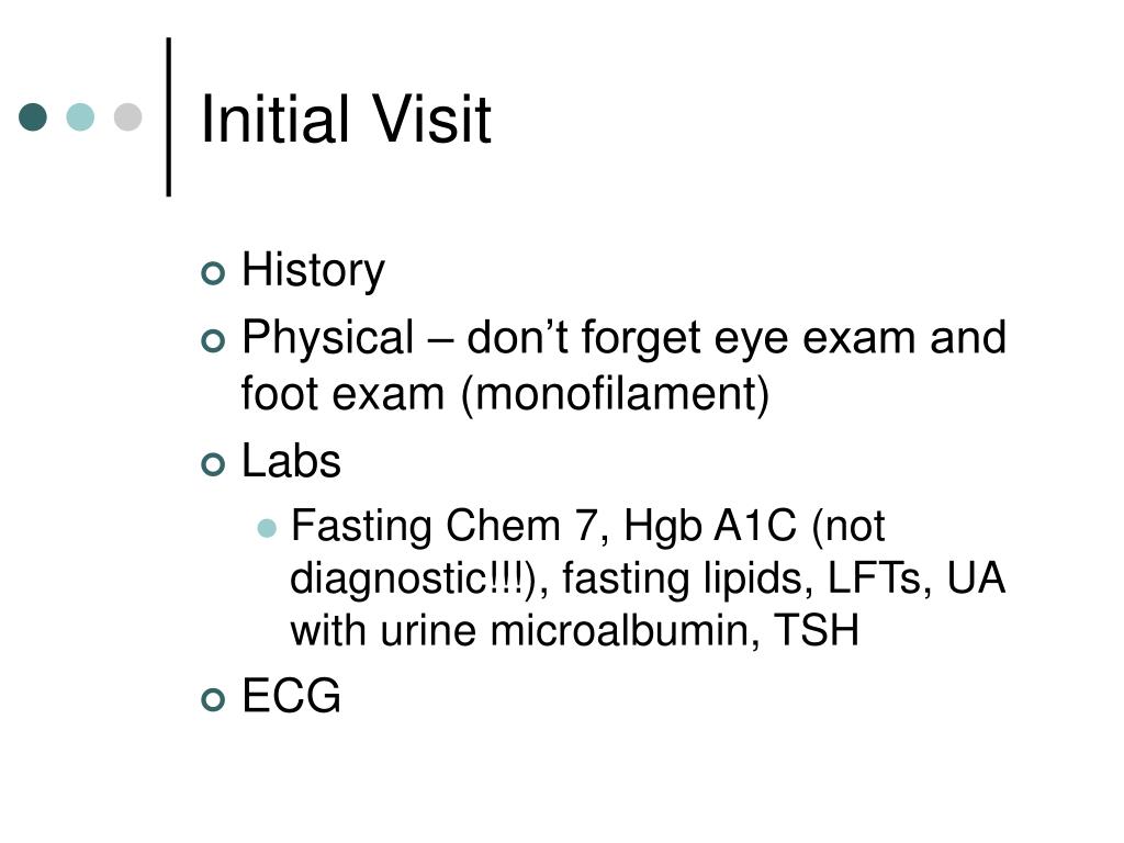 Initial Visit • History • Physical – don’t forget eye exam and foot exam (monofilament) • Labs • Fasting Chem 7, Hgb A1C (not diagnostic!!!), fasting lipids, LFTs, UA with urine microalbumin, TSH • ECG