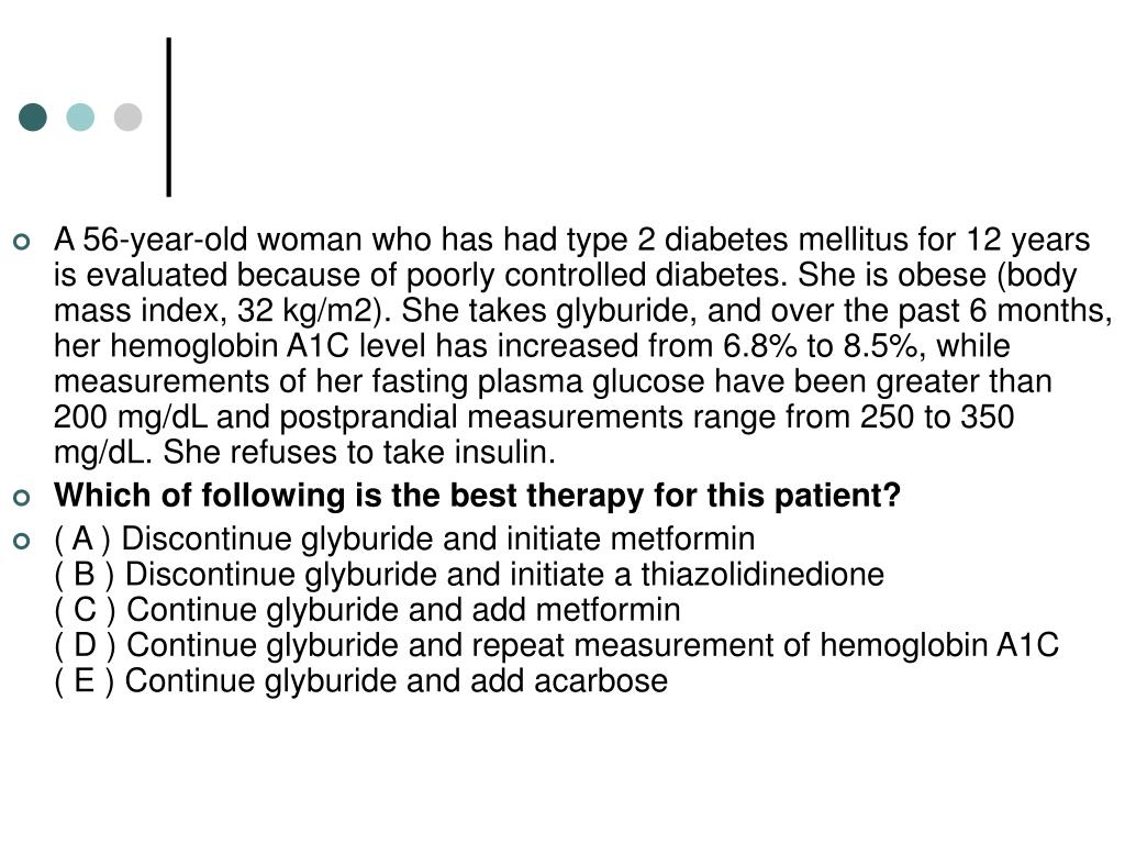 Critique (Correct Answer = C) • Type 2 diabetes mellitus is a progressive disorder, and studies have documented that response to monotherapy is limited. Four options are available to obese patients who have become unresponsive to sulfonylureas: 1) add metformin, 2) add a thiazolidinedione, 3) add an α-glucosidase inhibitor, and 4) add insulin. Arguably the best treatment could be to initiate insulin at bedtime and continue the sulfonylurea. There is no consensus about which option is most effective. Adding metformin to the regimen provides an effective agent that complements the action of sulfonylurea. Several studies document that fasting plasma glucose and hemoglobin A1C values decline with this combination of sulfonylurea and metformin in patients with body mass indexes in the range of 27 to 30 kg/m2. Maximum dosages (2000 mg) of metformin should be administered in divided doses. A trial of this combination for 6 to 8 weeks should determine its effectiveness. If hemoglobin A1C values do not fall to the 7.0% to 7.5% range, the patient should be encouraged to start insulin therapy. • A thiazolidinedione and acarbose (an α-glucosidase inhibitor) are less powerful as hypoglycemic agents than sulfonylureas and metformin, and probably would be less effective in this patient than combination therapy. The patient’s obesity indicates that insulin resistance is a likely factor in the progressive hyperglycemia, and a thiazolidinedione warrants consideration; however, if it is used, greater laboratory monitoring is required.
