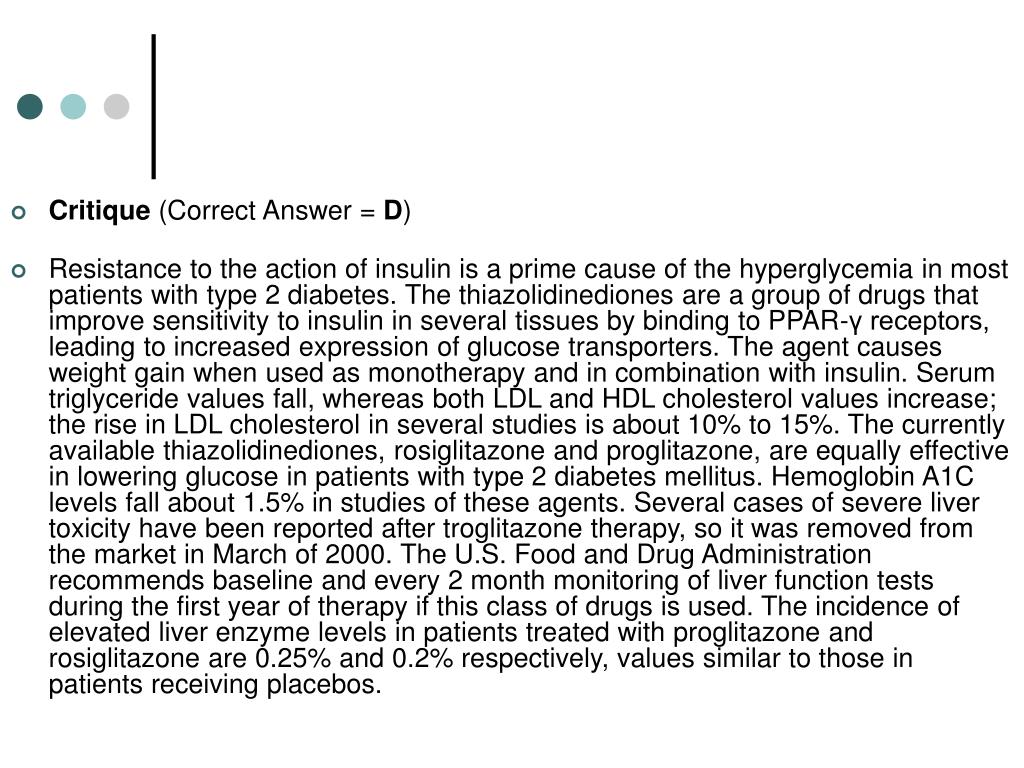 Critique (Correct Answer = D) • Resistance to the action of insulin is a prime cause of the hyperglycemia in most patients with type 2 diabetes. The thiazolidinediones are a group of drugs that improve sensitivity to insulin in several tissues by binding to PPAR-γ receptors, leading to increased expression of glucose transporters. The agent causes weight gain when used as monotherapy and in combination with insulin. Serum triglyceride values fall, whereas both LDL and HDL cholesterol values increase; the rise in LDL cholesterol in several studies is about 10% to 15%. The currently available thiazolidinediones, rosiglitazone and proglitazone, are equally effective in lowering glucose in patients with type 2 diabetes mellitus. Hemoglobin A1C levels fall about 1.5% in studies of these agents. Several cases of severe liver toxicity have been reported after troglitazone therapy, so it was removed from the market in March of 2000. The U.S. Food and Drug Administration recommends baseline and every 2 month monitoring of liver function tests during the first year of therapy if this class of drugs is used. The incidence of elevated liver enzyme levels in patients treated with proglitazone and rosiglitazone are 0.25% and 0.2% respectively, values similar to those in patients receiving placebos.