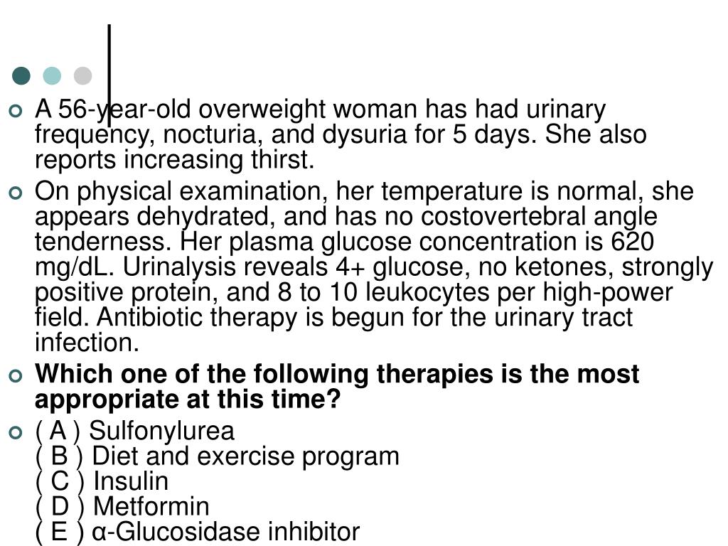 Critique (Correct Answer = C) • The therapeutic goals in this patient are to alleviate symptoms and control hyperglycemia. When a newly diagnosed patient has symptoms, evidence of a urinary tract infection and markedly elevated plasma glucose concentration, treatment with insulin is the best assurance that symptoms will resolve and that the infection will respond readily to appropriate therapy. Hospitalization is usually not warranted unless ketoacidosis or severe dehydration and hypotension are present. Some patients will respond to oral agents, such as metformin, but that response may be slow and insufficient to alleviate symptoms. After prolonged periods of markedly elevated glucose, the response to sulfonylureas is blunted as the beta cells of the pancreas produce little or no insulin because of the glucose toxicity. After 6 to 8 weeks of good glycemic control effected by insulin, therapy may be switched to an oral agent if the patient prefers. A benefit of tight glycemic control with intensive insulin therapy in such patients is the reversal of glucose toxicity, with the improvement of both insulin sensitivity and insulin secretion. α-Glucosidase inhibitors like acarbose, reduce postprandial hyperglycemia by delaying glucose absorption, but do no affect glucose utilization or insulin secretion. They are less potent agents and therefore would not be the correct agents to use to control her hyperglycemia. • Every patient with newly diagnosed diabetes mellitus should be offered an educational program that emphasizes the importance of diet and exercise. In symptomatic patients with this severe a degree of hyperglycemia, diet and exercise are inadequate to achieve the desired goals.