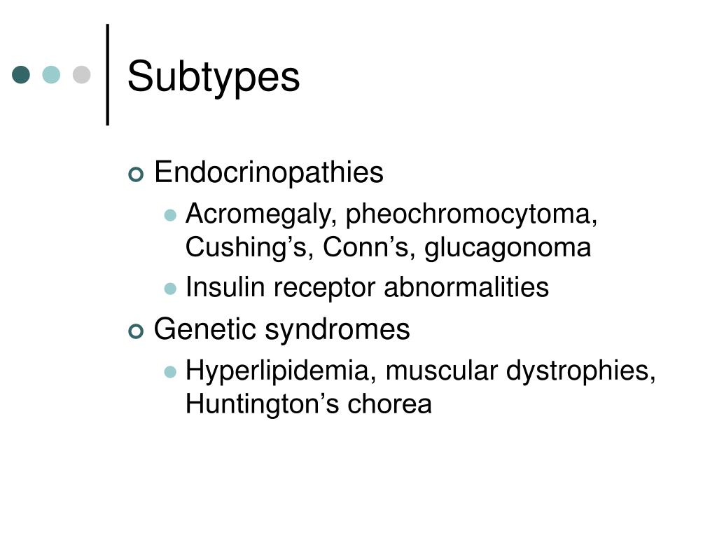 Subtypes • Endocrinopathies • Acromegaly, pheochromocytoma, Cushing’s, Conn’s, glucagonoma • Insulin receptor abnormalities • Genetic syndromes • Hyperlipidemia, muscular dystrophies, Huntington’s chorea