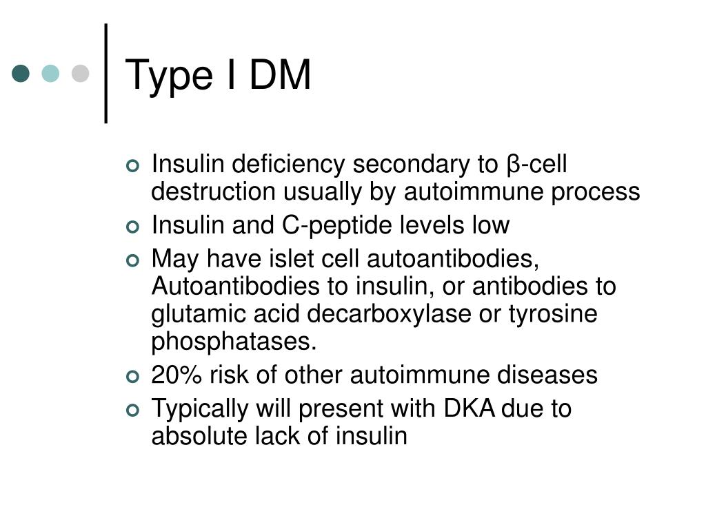 Type I DM • Insulin deficiency secondary to β-cell destruction usually by autoimmune process • Insulin and C-peptide levels low • May have islet cell autoantibodies, Autoantibodies to insulin, or antibodies to glutamic acid decarboxylase or tyrosine phosphatases. • 20% risk of other autoimmune diseases • Typically will present with DKA due to absolute lack of insulin