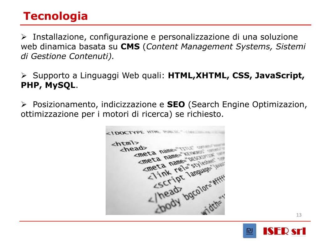 Tecnologia • Installazione, configurazione e personalizzazione di una soluzione web dinamicabasata su CMS (Content Management Systems, Sistemi di Gestione Contenuti). • Supporto a Linguaggi Web quali: HTML,XHTML, CSS, JavaScript, PHP, MySQL. • Posizionamento, indicizzazione e SEO (SearchEngineOptimizazion, ottimizzazione per i motori di ricerca) se richiesto.