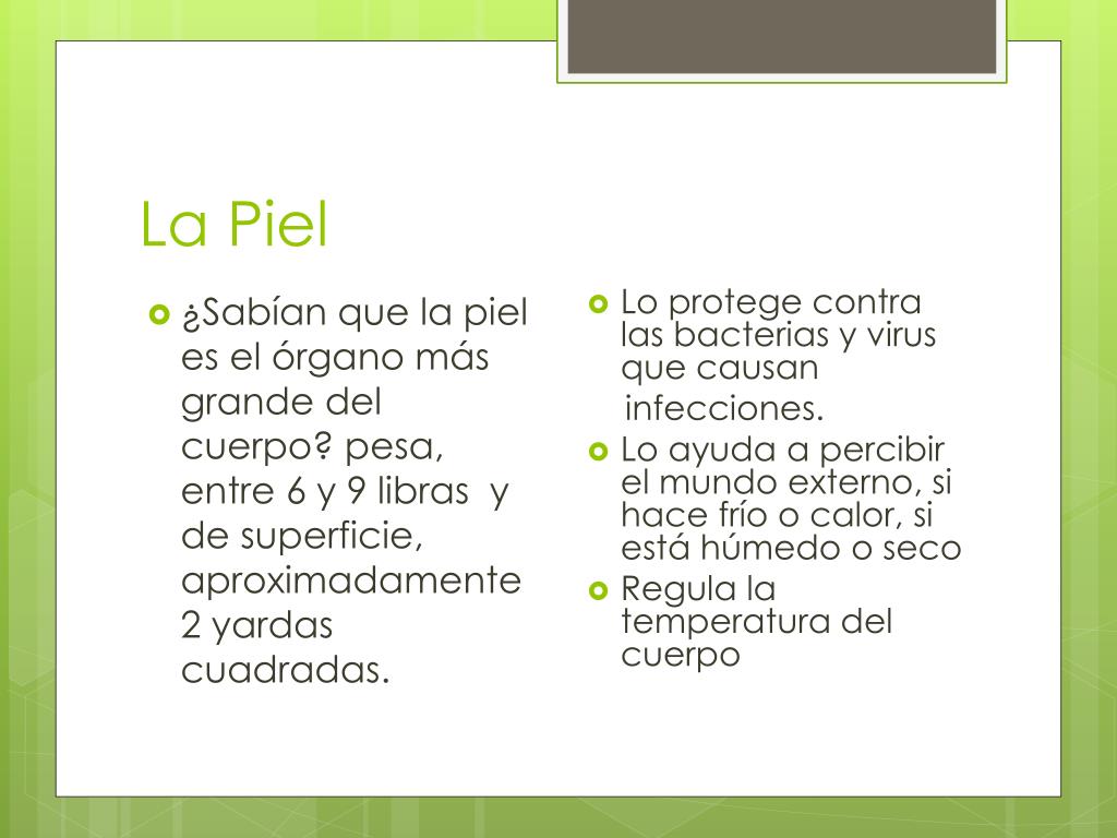 La Piel • ¿Sabían que la piel es el órgano más grande del cuerpo? pesa, entre 6 y 9 libras y de superficie, aproximadamente 2 yardas cuadradas. • Lo protege contra las bacterias y virus que causan infecciones. • Lo ayuda a percibir el mundo externo, si hace frío o calor, si está húmedo o seco • Regula la temperatura del cuerpo
